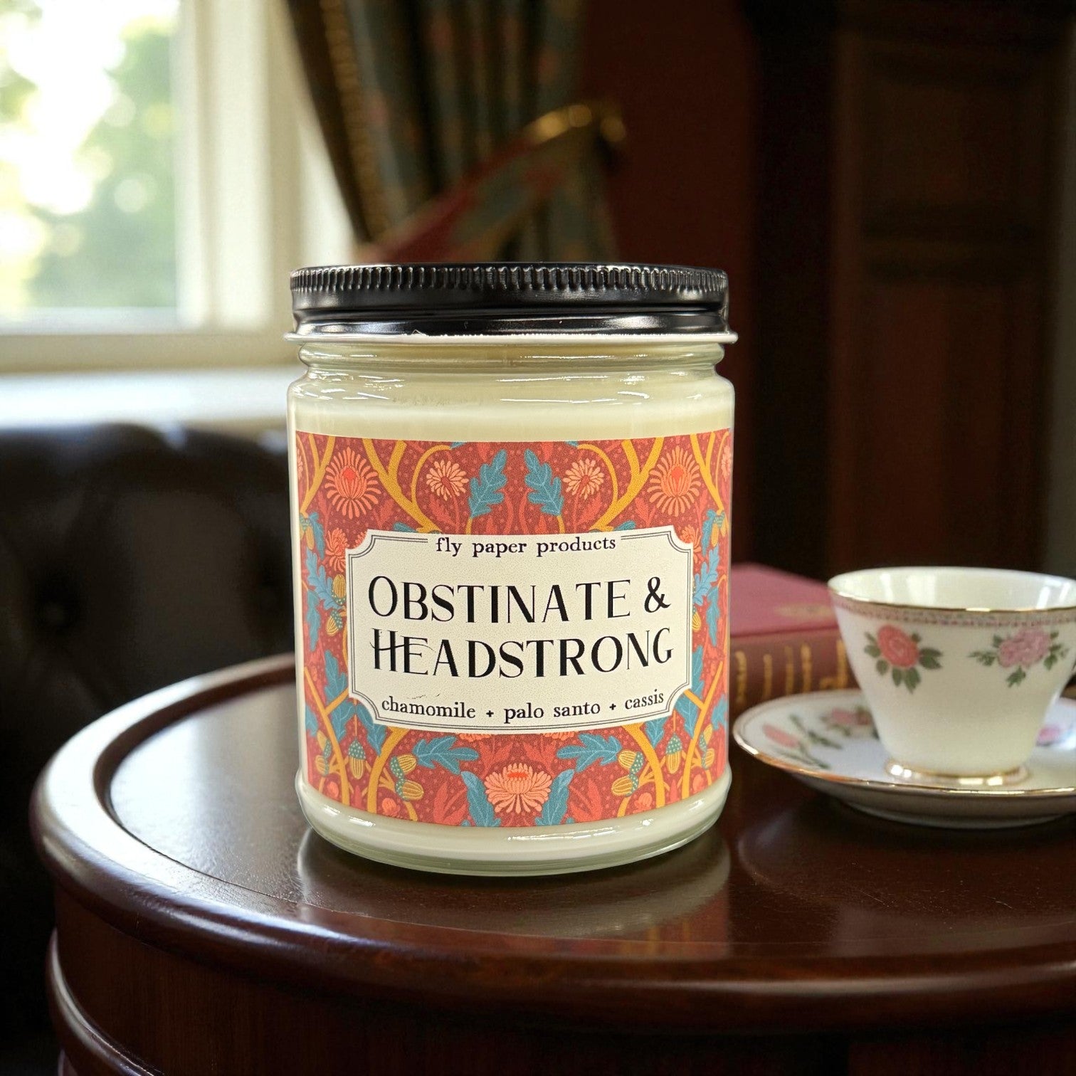 Lady Catherine de Bourgh said to Elizabeth Bennett in "Pride and Prejudice" as an insult, but we take 'Obstinate and Headstrong' as a compliment. Our candle has hints of the mineral waters at Bath complemented by orange and sage and underpinned with the warmth of palo santo.