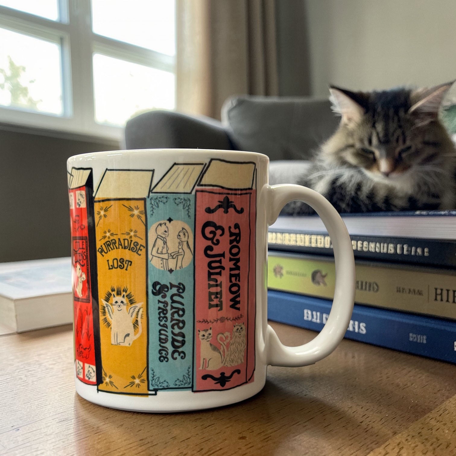 This charming design is a love letter to cat lovers and book lovers alike, showcasing literary classics reimagined with a whiskered twist — think The Great Catsby, A Tail of Two Kitties, Purride & Prejudice, Les Meowserables, Romeow & Juliet, and more. Each colorful “book spine” wraps around the mug like a perfectly curated library… but make it feline.