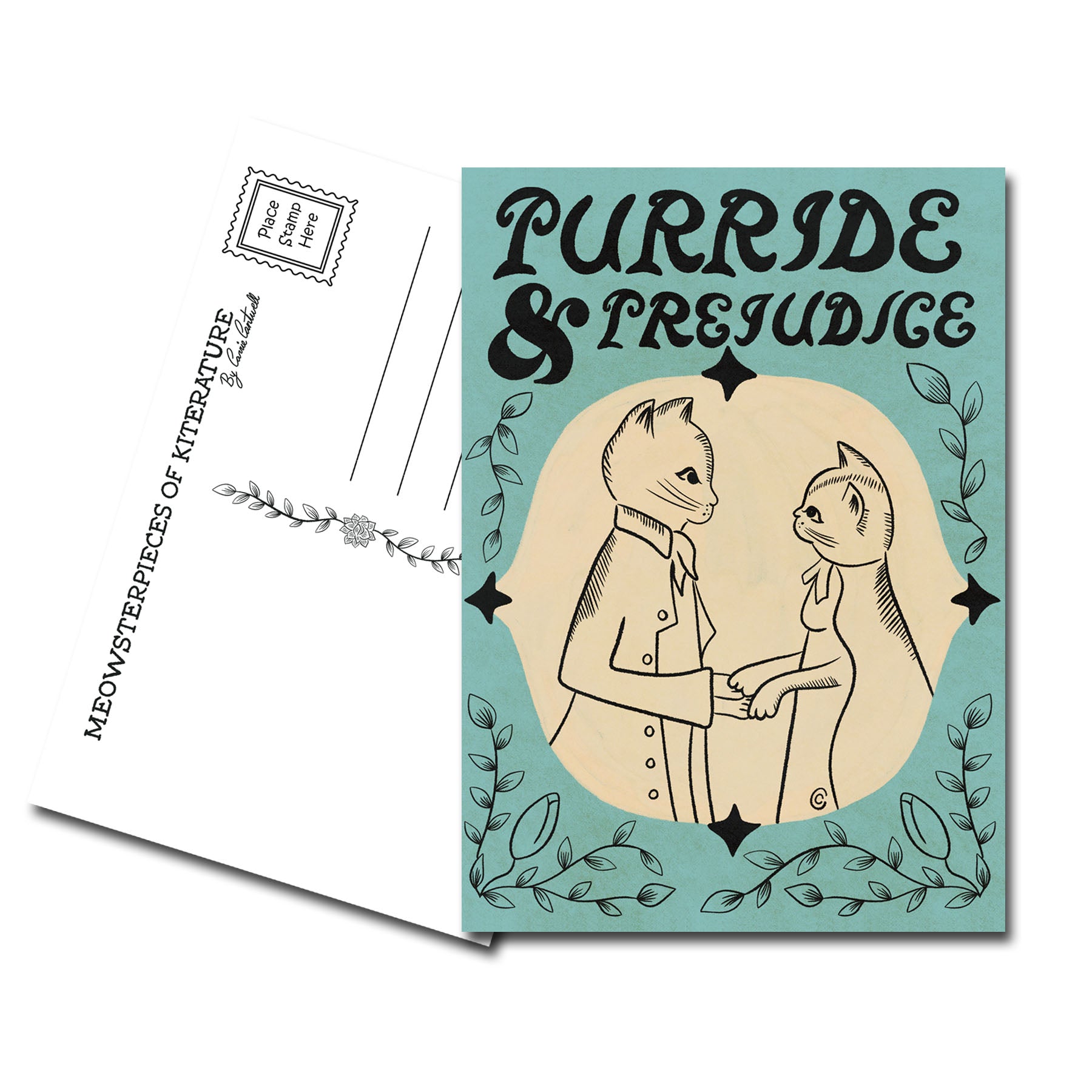 Delight in the whimsy of our 'Purride and Prejudice' postcard, featuring an artist's illustration by Carrie Cantwell. This charming cat pun postcard is an homage to all book lovers and grammar geeks who appreciate nostalgic imagery. Our products, inspired by vintage books and grammar themes, are cherished by customers across multiple generations.