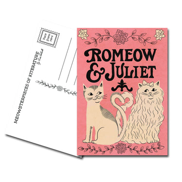 Delight in the whimsy of our 'Romeow and Juliet' postcard, featuring an artist's illustration by Carrie Cantwell. This charming cat pun postcard is an homage to all book lovers and grammar geeks who appreciate nostalgic imagery. Our products, inspired by vintage books and grammar themes, are cherished by customers across multiple generations.