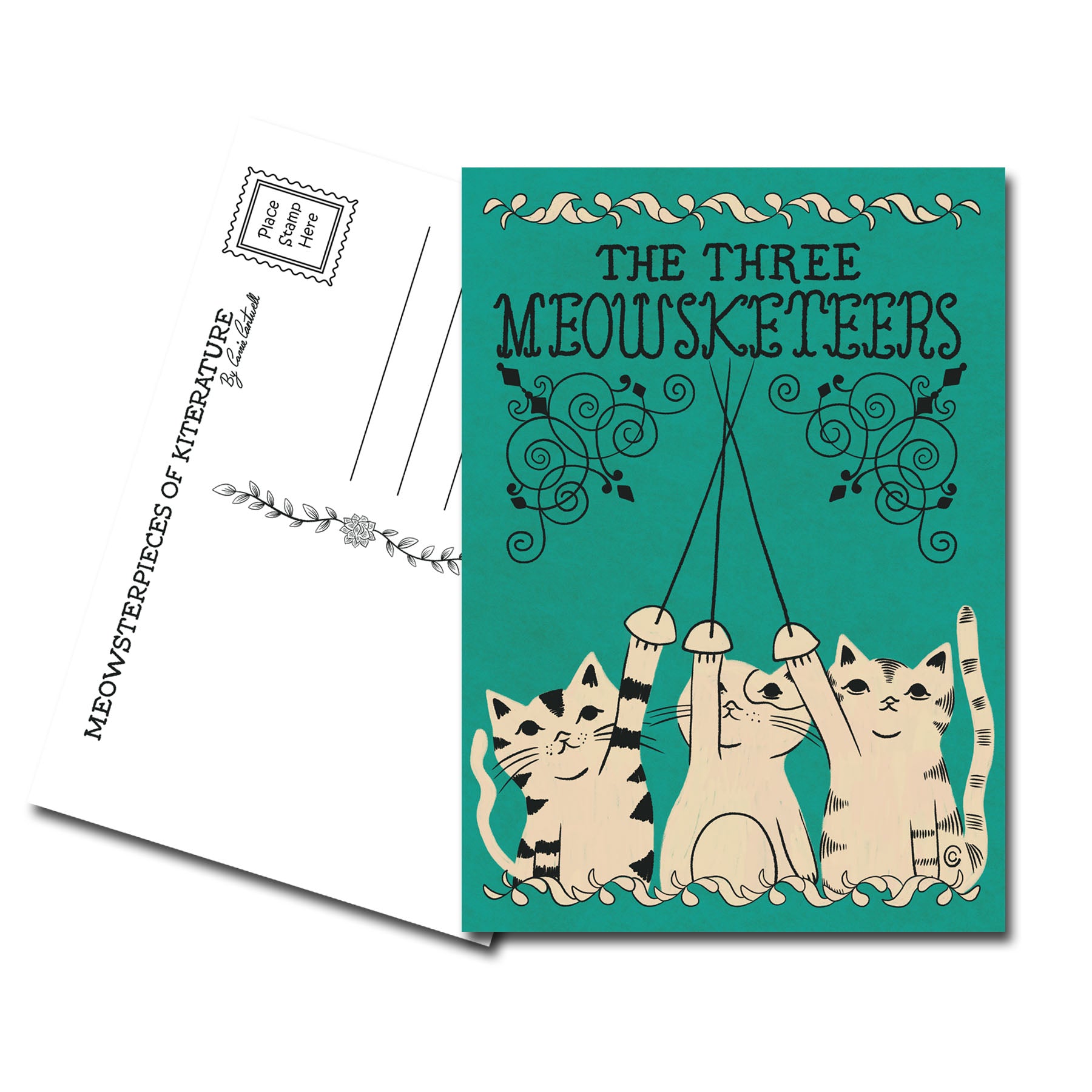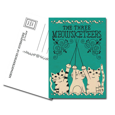 Delight in the whimsy of our 'The Three Meowsketeers' postcard, featuring an artist's illustration by Carrie Cantwell. This charming cat pun postcard is an homage to all book lovers and grammar geeks who appreciate nostalgic imagery. Our products, inspired by vintage books and grammar themes, are cherished by customers across multiple generations.
